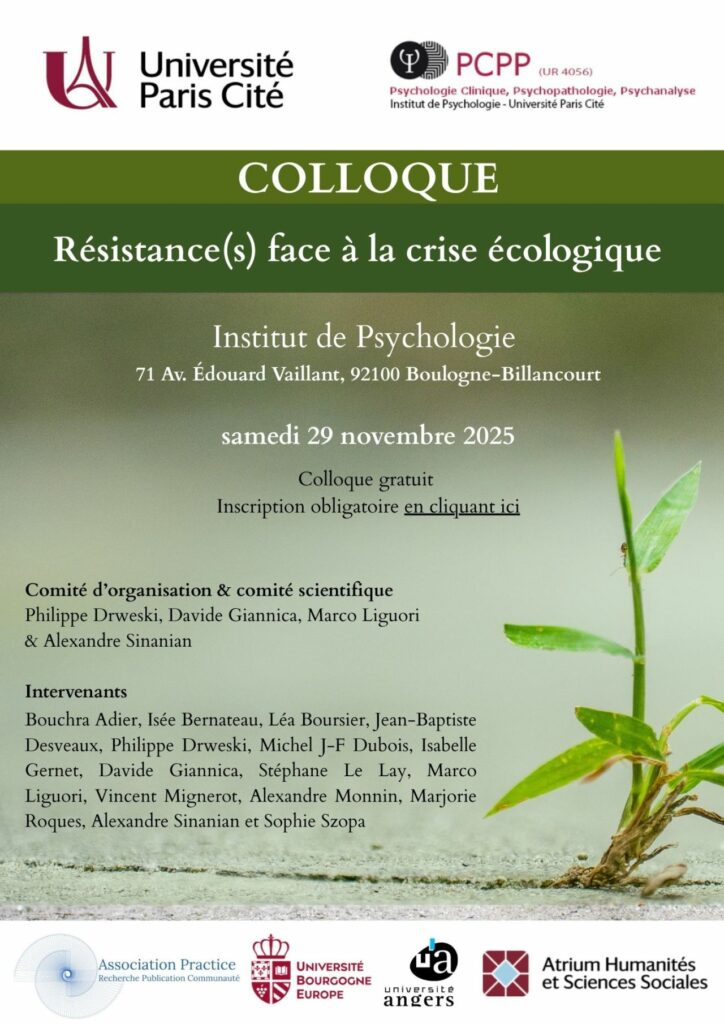 La crise écologique est systémique et met à mal les fondements sur lesquels notre société, notre civilisation et nos psychismes s’étayent et se structurent. Face à cette situation les apports des science humaines et sociales ainsi que de la psychologie clinique apparaissent fondamentaux afin de mieux en comprendre la portée et imaginer des voies de dégagements possibles. L’objectif de ce colloque est ici d’interroger les résistances face à la crise écologique à plusieurs niveaux.
